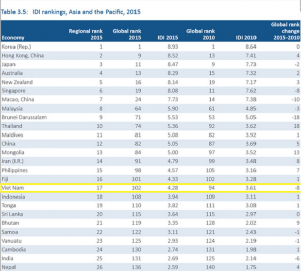 So với thứ hạng của năm 2010, tốc độ Internet tại Việt Nam đã tụt 8 bậc, đứng thứ 17 trong khu vực châu Á - Thái Bình Dương và thứ 102 thế giới. Báo cáo này dựa trên các chỉ số phát triển ICT đặc biệt, như tốc độ Internet, thống kê tương đối về số người sử dụng Internet, và tỷ lệ dân cư có máy tính.