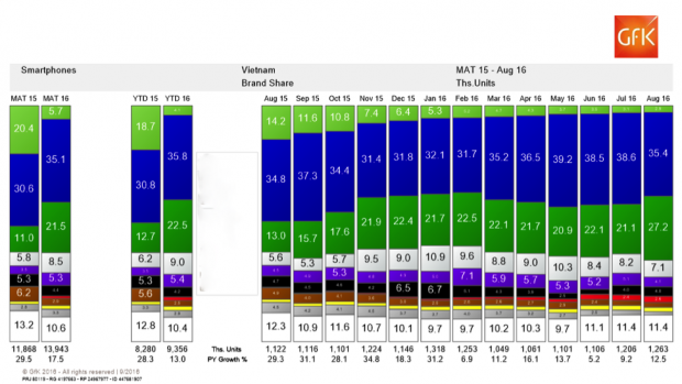 Số liệu thống kê đến tháng 8/2016 của GfK cho thấy, thị phần smartphone Việt Nam vẫn bị ngự trị bởi Samsung, với 35,4% thị phần trong tháng 8. Tiếp sau đó là Oppo 27,2% thị phần và Apple đạt 7,1% thị phần. Cộng cả 3 hãng lớn thì thị phần chiếm đến 70% tổng thị trường smartphone, đẩy hàng chục thương hiệu khác về mức 30%.