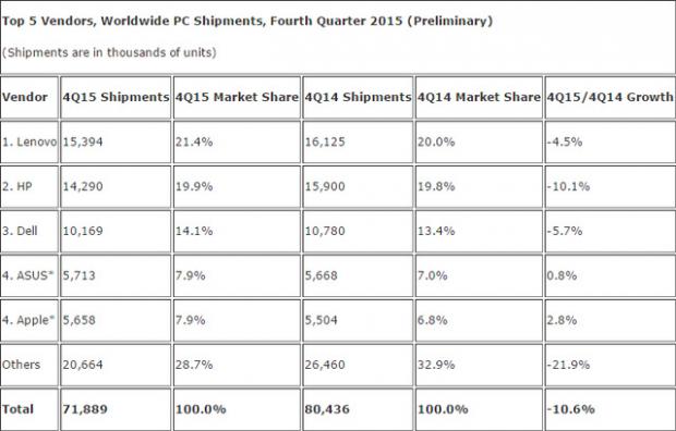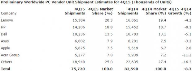 Theo Gartner, doanh số PC trên toàn thế giới giảm 8,3% xuống 75,7 triệu máy trong Q4/2015. Top 5 nhà sản xuất máy tính hàng đầu thế giới là Lenovo, HP, Dell, Asus và Apple. Tuy nhiên có một điểm đáng chú ý, đó là trong khi thị trường sụt giảm và tất cả các nhà sản xuất máy tính đều tăng trưởng âm so với cùng kỳ năm ngoái, chỉ riêng Apple là có doanh số đi lên.