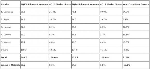 Lenovo (Trung Quốc) đứng thứ 4 trong Q4 với 20,2 triệu thiết bị được bán ra, chiếm 5,1% thị phần. Nhưng mức tăng trưởng của Lenovo lại đạt đến 43,6% so với cùng thời điểm năm 2014. Vị trí thứ 5 là của Xiaomi với 4,6% thị phần, tương đương với 18,2 triệu thiết bị cầm tay được tiêu thụ (tăng từ 16,5 triệu trong Q4/2014).