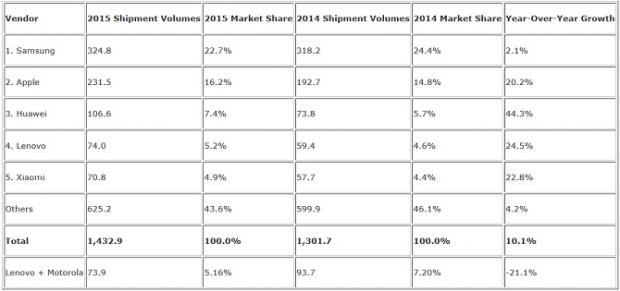 Tính cả năm 2015 thì Samsung bán ra được tổng cộng 324,8 triệu điện thoại thông minh với 22,7% thị phần toàn cầu, tăng 2,1% so với năm trước. Với Apple, con số 231,5 triệu thiết bị bán ra giúp họ đạt tốc độ tăng trưởng 20,2% (tính trên doanh số) và chiếm 16,2% thị trường toàn cầu.