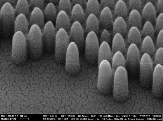 Còn đặc tính chống chói hay chống phản chiếu có được nhờ một cấu trúc nano (hình trên) mô phỏng cấu trúc gồm nhiều hình nón có trên mắt của bướm đêm và nhiều sinh vật khác nhằm ẩn nấp trước kẻ săn mồi. Các nhà nghiên cứu cho biết đây là lần đầu tiên một cấu trúc nano lấy ý tưởng từ sinh học được kết hợp với một lớp phủ nhiệt hóa học. Kết quả là chúng ta có một chiếc cửa kính với bề mặt có thể tự làm sạch, giảm 40% tiền điện dành cho các hệ thống điều hòa đồng thời giảm chi phí bảo trì, cải thiện sự thoải mái và tăng năng suất cho nhân viên. Chưa rõ khi nào cửa kính thông minh của UCL và EPSRC được sản xuất thương mại.