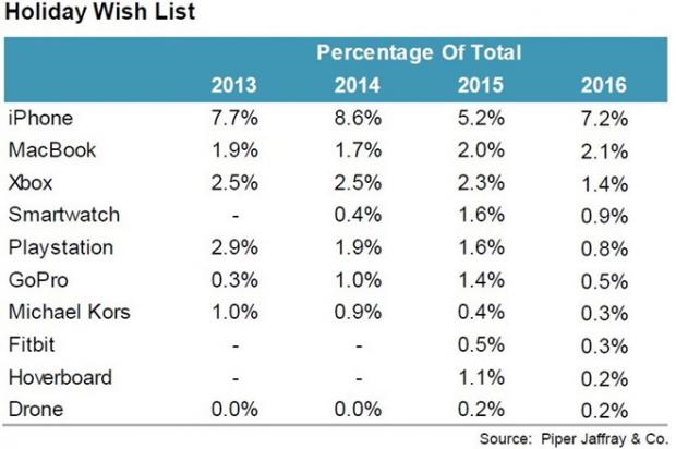 Trong đó, iPhone chính là sản phẩm người dùng Mỹ khao khát được nhận nhất. 7,2% số người được hỏi muốn một chiếc iPhone mới dịp Giáng sinh, tăng mạnh so với mức 5,2% năm ngoái. MacBook xếp vị trí thứ 2 trên bảng xếp hạng với 2,1%.