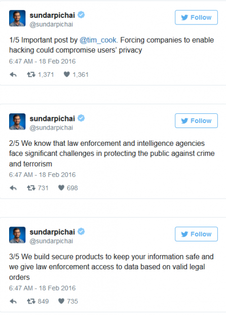 Ông Pichai đã thể hiện quan điểm của mình trên Twitter. Ông cho biết sự ép buộc từ phía cơ quan công quyền có thể khiến thông tin của người dùng không còn an toàn.