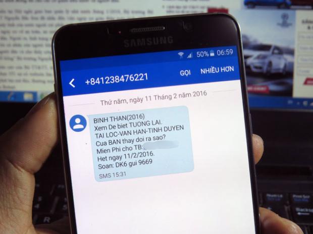 Một tin nhắn rác mời xem vận hạn, tình duyên phát tán dịp Tết Bính Thân. Ảnh: Nguyên Đức.