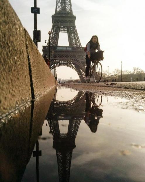 Một hình ảnh ở 'kinh đô ánh sáng' Paris phản chiếu qua một vũng nước.