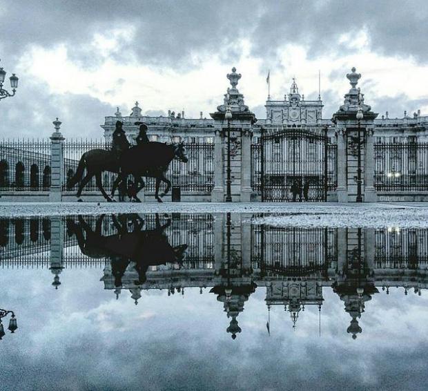 Một bức ảnh ấn tượng chụp phản chiếu qua vũng nước ở Madrid, Tây Ban Nha.