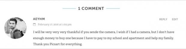 Tuy nhiên, anh lại đến từ Syria và tất nhiên không thuộc trong phạm vi trao thưởng chiếc máy ảnh trị giá 500 USD này. Aeyhm đã gửi comment đến cuộc thi và bày tỏ rằng anh rất muốn nhận được chiếc máy ảnh này. Anh ước có được chiếc máy ảnh nhưng không có đủ tiền để sắm một chiếc vì còn phải trang trải chi phí cho việc học và nhà ở cũng như phụ giúp cho gia đình.