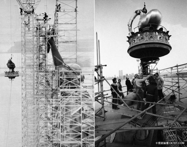 Hình ảnh các công nhân sửa chữa lại ngọn đuốc trong tay Nữ thần năm 1984-1985.
