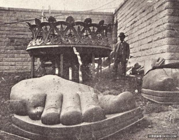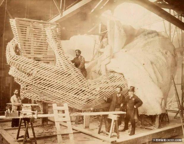 Hình ảnh các công nhân đang chế tác cánh tay của pho tượng năm 1883.