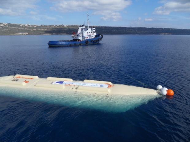 Trong thử nghiệm, sau hai ngày đổ đầy nước sạch, container nổi khổng lồ sẵn sàng cho hành trình đầu tiên trên mặt biển. Thiết kế của nó vừa chắc chắn để có thể đứng lên, vừa linh hoạt để cho phép sóng biển tràn qua.