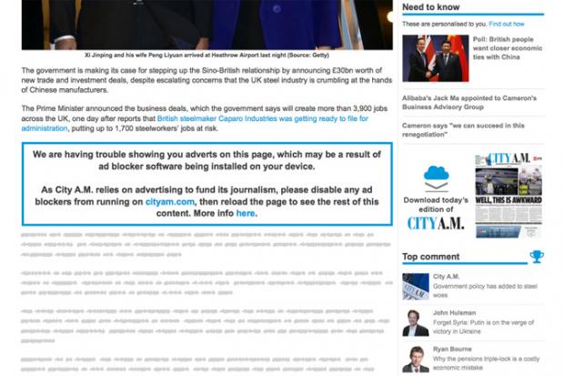 City A.M., một tờ báo doanh nghiệp miễn phí tại London hiện đang là một trong những nhà phát hành nội dung đầu tiên thử nghiệm chặn người xem nếu như họ có cài đặt ứng dụng adblock. CityA.M., một đối tác của startup chuyên chống adblock Rezonence, cho biết có khoảng 1/4 độc giả của họ có sử dụng ứng dụng adblock, nhưng từ khi bắt đầu chiến lược này vào tháng 10/2015, 'lưu lượng truy cập không bị giảm ở mức nhận thấy được'.