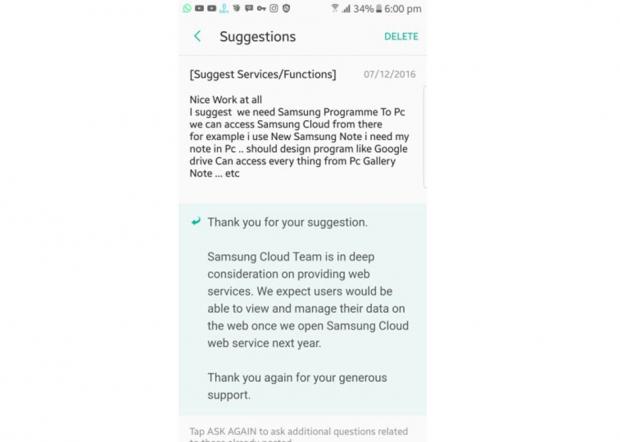 Samsung trả lời rằng đội ngũ phát triển dịch vụ Samsung Cloud đang trong quá trình 'tích hợp sâu dịch vụ' trên nền tảng web để người dùng sẽ có thể xem và quản lý dữ liệu của họ trên web. Samsung cũng nhấn mạnh rằng thời gian mà dịch vụ này chính thức có mặt trên máy tính sẽ là trong năm sau. Tuy nhiên công ty lại không cung cấp thời gian chính xác.