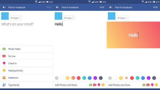 Để tạo một status “ngầu” như trên, bạn có thể thử nhấn vào khung đăng status và kiểm tra. Lúc mở lên thì sẽ không có gì khác biệt, nhưng khi bắt đầu gõ thì khung chọn màu sắc sẽ hiện ra. Có đầy đủ các màu từ tươi tắn, rực rỡ đến màu xám u buồn để bạn lựa chọn tùy theo tâm trạng của mình.