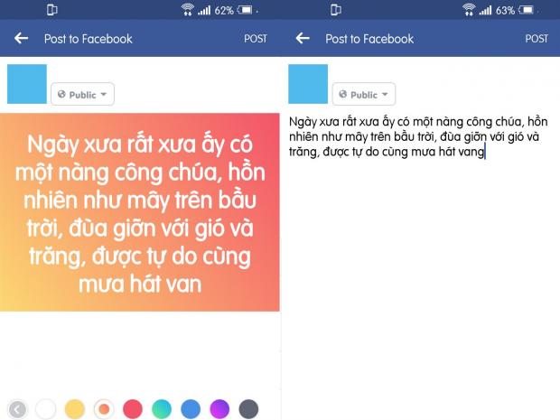Nhưng có một lưu ý là nếu status của bạn quá dài thì có thể không sử dụng được tính năng này, mình đã thử viết khoảng 3 dòng thì status của mình sẽ tự nhảy về dạng bình thường chứ không có màu nữa.