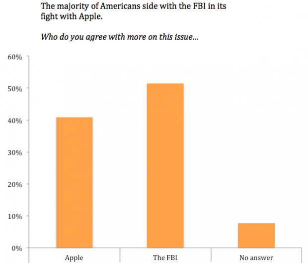 Khảo sát của Survey Monkey cũng cho thấy kết quả tương tự, với chỉ trên 40% người Mỹ ủng hộ Apple và khoảng 50% ủng hộ FBI.