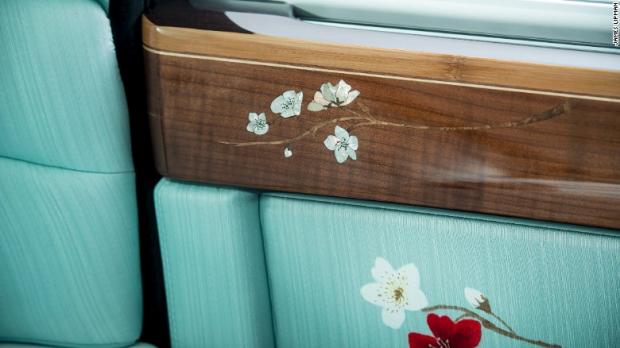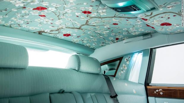 Toàn bộ nội thất – từ ghế ngồi, tới trần xe – được phủ lên một lớp vải lụa màu xanh phấn có nguồn gốc từ Tô Châu, một trong những kinh đô thêu lụa của Trung Quốc, và được dệt tại một trong những nhà máy lâu đời nhất của Vương quốc Anh, theo CNN.