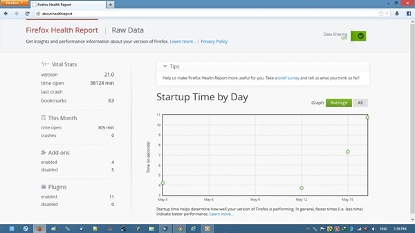 Ngoài ra Firefox Health Report cũng sẽ tự động gửi về Mozilla những thông tin ẩn danh (được giữ bí mật cho người dùng) các lỗi gặp phải trong quá trình sử dụng, để từ đó Mozilla có giải pháp nâng cấp hợp lý trong các phiên bản tới… Bạn có thể xem báo cáo về tình trạng dữ liệu và bộ nhớ đang được sử dụng bằng cách nhập ‘аbout:healthreport’ vào thanh địa chỉ và nhấn Enter.