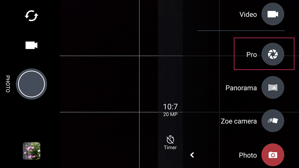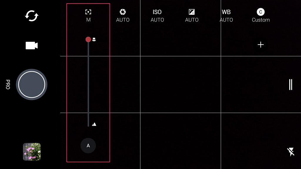 Sau đó, giao diện chế độ Pro xuất hiện, bạn chỉ cần để ý phần focus, thường thì phần này có icon là cái khung lấy nét, khi nhấn vào sẽ có 1 cái cột với một đầu có icon như một bông hoa (thường gọi là chụp macro) và một đầu có biểu tượng hình quả núi (thường gọi là phong cảnh). Bạn điều chỉnh cho mức focus ở đầu macro (icon bông hoa) như hình bên dưới.