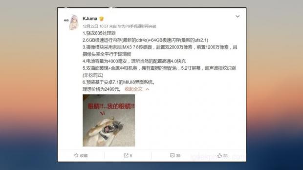 Mới đây, tài khoản chuyên đăng tải tin rò rỉ nổi tiếng KJuma đã đăng tải trên trang Weibo một số thông tin quan trọng về phần cứng và ngày ra mắt dự kiến của Xiaomi Mi6, cho thấy đây là thiết bị có cấu hình rất mạnh mẽ.