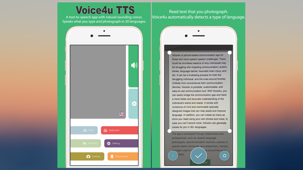 Voice4u TTS - Type or OCR to Talk là một ứng dụng chuyển văn bản thành giọng nói. Nó có thể đọc được cả hình ảnh chụp bởi camera. Hơn nữa, Voice4u TTS hỗ trợ hơn 30 ngôn ngữ.