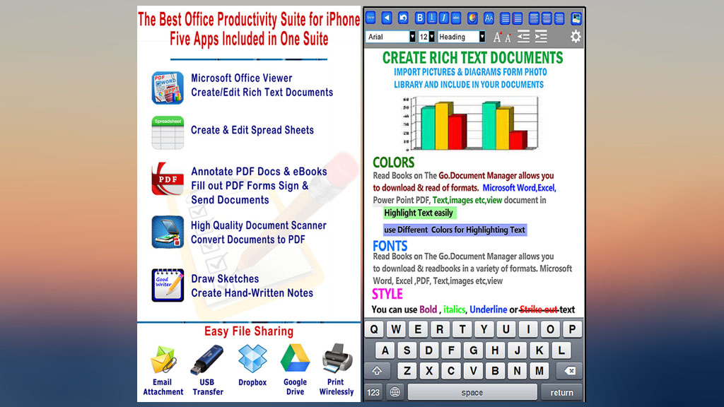 Office Suite là bộ ứng dụng văn phòng chuyên nghiệp dành cho iPhone/ iPad bạn có thể xem, biên tập hoặc chỉnh sửa nội dung văn bản, bảng tính, file trình chiếu một cách dễ dàng.