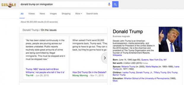 Kết quả về quan điểm ứng viên Tổng thống Mỹ được thể hiện ngay trên trang tìm kiếm của Google