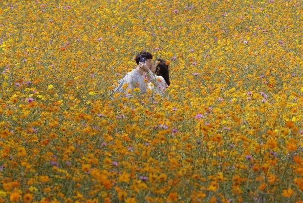 Một cặp đôi người Hàn Quốc vừa hôn vừa tự sướng ở cánh đồng hoa bướm rực rỡ tại Công viên Olympic, Seoul vào 21/9.