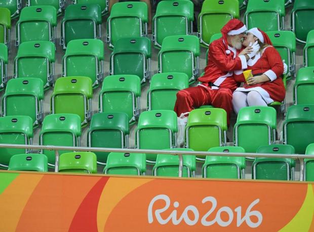 Khán giả hôn nhau trên khán đài của SVĐ Olympic ở Rio trong trang phục ông già Noel vào 16/8.