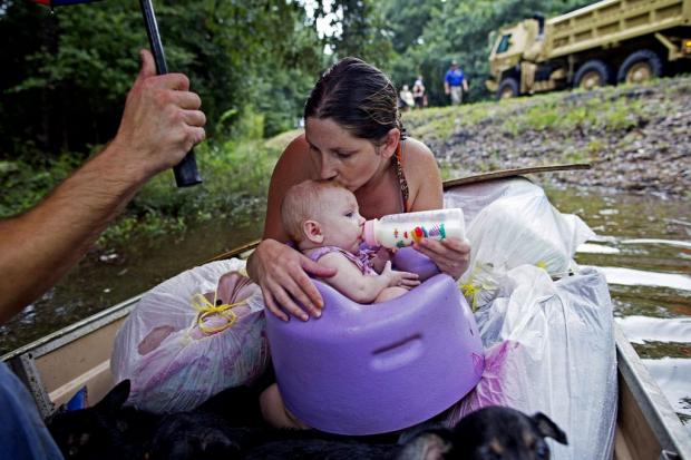 Danielle Blount đang cho cô con gái bé bỏng Ember 3 tháng tuổi bú sữa, trong khi chờ đợi lực lượng giải cứu khỏi trận lụt lớn tại Walker, Louisiani vào 14/8.