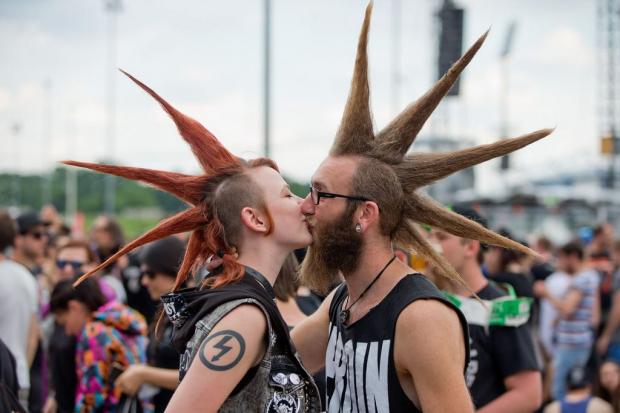 Một cặp đôi đóng giả người Mohawks hôn nhau đắm đuối trong lễ hội âm nhạc 'Rock in the park' tại Nuremberg, Đức vào 5/6.