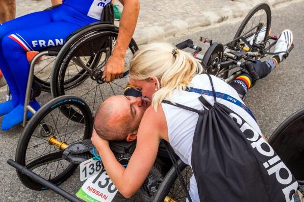 Vận động viên khuyết tật người Đức Vico Merklein đang hôn người bạn gái của mình là Linda Klingenberg, sau khi đoạt huy chương vàng ở đường đua H4 ở Rio Paralympic Game tại Brazil hôm 15/9.