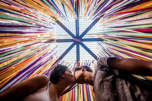 Một đôi tình nhân trẻ, người sơn vẻ mặt bằng cờ châu Âu, người sơn vẻ mặt bằng cờ Anh, đang khóa môi trong lễ hội Kiss Marathon tại Berlin, Đức ở tháng 6. Thông qua sự kiện này, người tổ chức muốn các nước châu Âu thắt chặt tình đoàn kết hơn nữa.