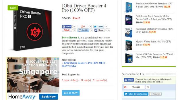 Bước 1: Truy cập địa chỉ Giveaway IObit Driver Booster Pro (100% OFF) > nhấn nút 'GET IT NOW' để nhận liên kết tải phần mềm và mã kích hoạt bản quyền.