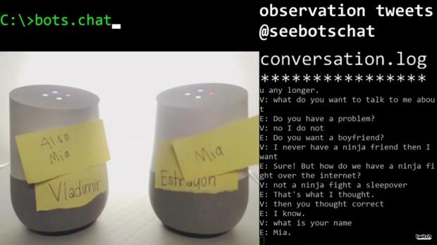 Thực tế thì không có thông tin gì nhiều trên kênh Twitch kỳ dị này, chỉ là hai chiếc Google Home cãi nhau, rồi nói lời yêu nhau, rồi bàn chuyện cuộc sống,…nói chung là tùm lum thứ trên đời. Hai bot này liên tục nói chuyên với nhau không ngừng nghỉ. Lúc mình xem thì chúng nó còn cầu hôn nhau, WTF??? Đây có lẽ là cuộc trò chuyện quái nhất thế giới robot từ trước đến giờ: