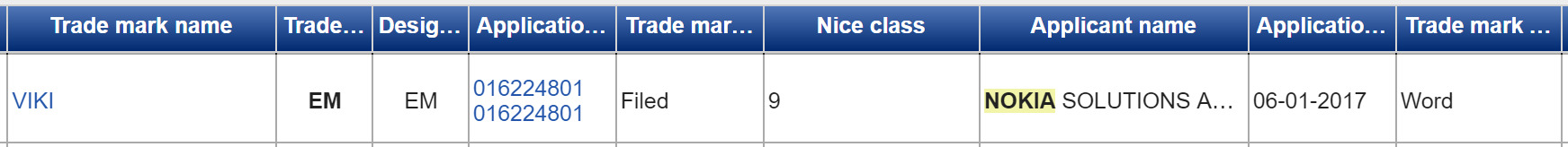 Theo thông tin từ GSMInfo, Nokia đã nộp hồ sơ đăng ký nhãn hiệu mới tại Châu Âu cho tên gọi 'Viki' và đây sẽ là dịch vụ trợ lý cá nhân ảo mà hãng công nghệ Phần Lan HMD Global phát triển để cạnh tranh trực tiếp của các dịch vụ trí thông minh nhân tạo tương tự vốn đang rất phổ biến hiện nay như Apple Siri, Microsoft Cortana và Google Assitant. HMD Global là công ty mới được thành lập và đang được Nokia ký hợp đồng nhượng quyền độc quyền sẽ cho phép phát triển và sản xuất toàn bộ danh mục sản phẩm mang thương hiệu Nokia từ điện thoại cơ bản đến điện thoại thông minh, máy tính bảng trong vòng 1 thập niên tới.