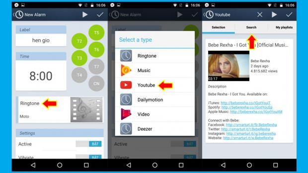Bước 3: Để chọn video để đặt báo thức, bạn nhấn vào mục 'Ringtone' > chọn dịch vụ Youtube. Tiếp theo, bạn nhấn vào mục 'Search' trên giao diện và tìm video đặt báo thức và nhấn dấu tích 'V' để lựa chọn.