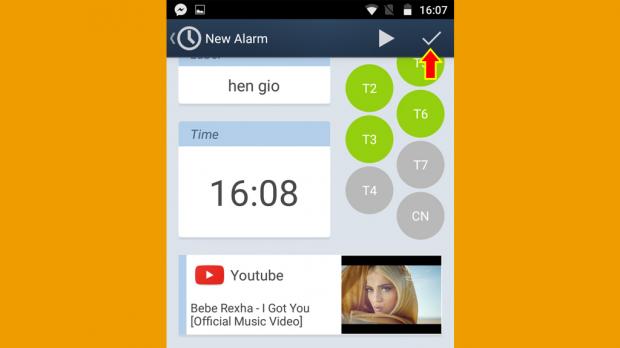 Bước 4: Để lưu cài đặt báo thức, bạn nhấn dấu tích 'V' góc trên bên phải màn hình là xong.