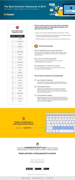 Như bạn đã thấy, hầu hết những mật khẩu trên như được người dùng đặt ra bằng cách lướt ngón tay trên hàng loạt phím bấm liên tiếp nhau mà không hề tính đến việc đặt mật khẩu an toàn gồm chữ, chữ viết hoa, số và ký tự để giảm khả năng bị đánh cắp. Infographic dưới đây là toàn bộ 25 mật khẩu được sử dụng nhiều nhất, cùng với một số lời khuyên được Keeper đưa ra như bạn nên dùng nhiều ký tự khác nhau, né những từ thông dụng và sử dụng chương trình quản lý mật khẩu.