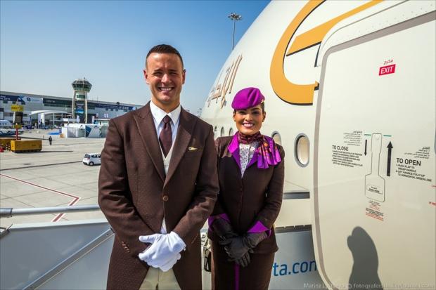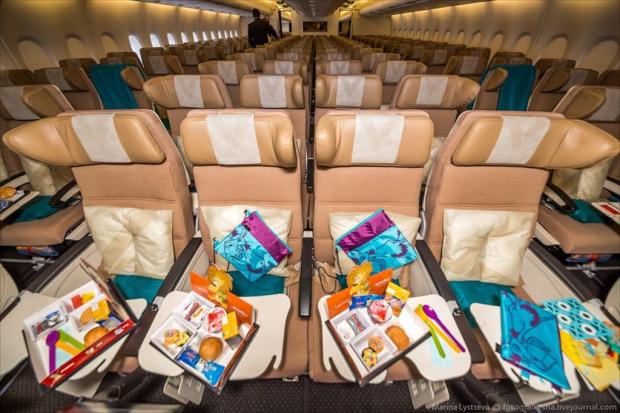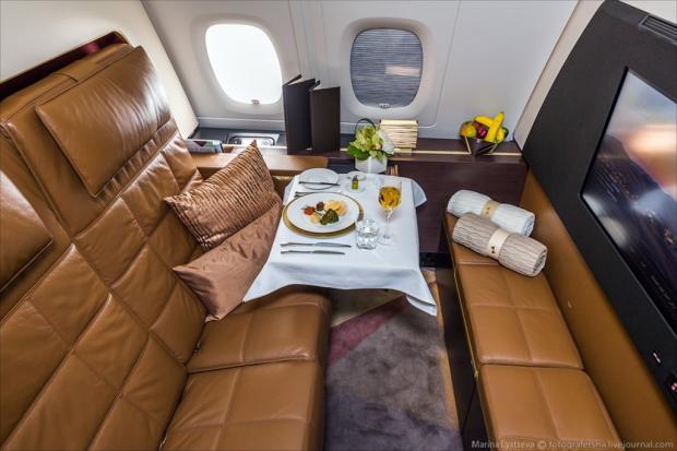 Chiếc Airbus 380 có hai tầng cùng với 4 loại ghế: hạng phổ thông, hạng thương gia, hạng nhất và hạng 'residence'. Loại cuối cùng nằm ở tầng trên của máy bay.
