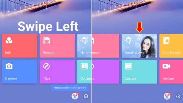 Mở ứng dụng Meitu, trên giao diện chính bạn sẽ thấy một số tính năng như chỉnh sửa, làm đẹp v.v... > vuốt sang trái màn hình và chọn mục Hand-draw.