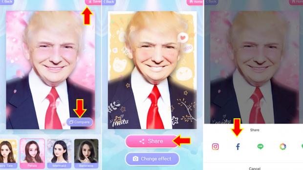 Nhấn vào nút 'Compare' để so sánh ảnh mới và ảnh gốc, chọn 'Save' để lưu hình ảnh về thiết bị hoặc chia sẻ trực tiếp lên mạng xã hội Facebook, Instagram, Line v.v...