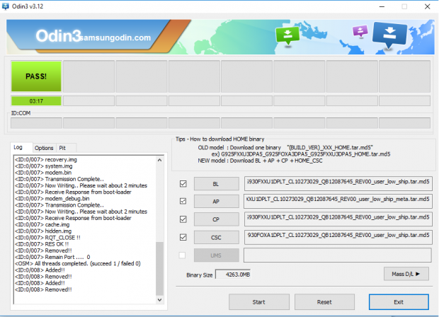 Sau khi bạn thấy có chữ PASS màu xanh lá cây hiện lên thì nghĩa là đã update thành công. Lúc này hãy tháo cáp ra và điện thoại sẽ khởi động lại. Quá trình khởi động sau khi update hệ điều hành sẽ khá lâu, khoảng vài phút. Sau khi máy khởi động xong thì chúc mừng, bây giờ bạn đã có thể tận hưởng Android Nougat trên chiếc S7 của mình. Mình sẽ gửi các bạn bài trải nghiệm bản Android Nougat trên Galaxy S7/ S7 edge trong thời gian sớm nhất.