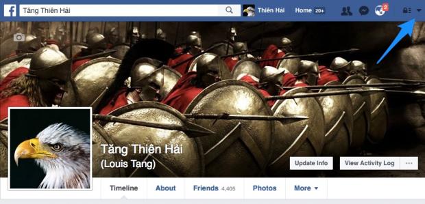 Bước 1: Truy cập Facebook.com trên trình duyệt máy tính. Chọn vào nút hình mũi tên trên thanh thông báo của trang Facebook, một danh sách các chức năng sẽ được hiển thị, chọn Settings.