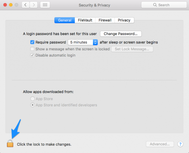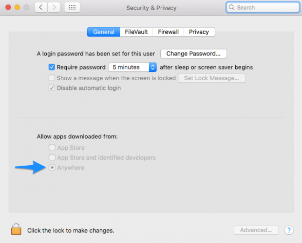 Bước 3: Chọn tab General, bạn sẽ thấy phần Allow apps downloaded from, nếu có 3 lựa chọn thì chọn Anywhere ở dưới cùng.