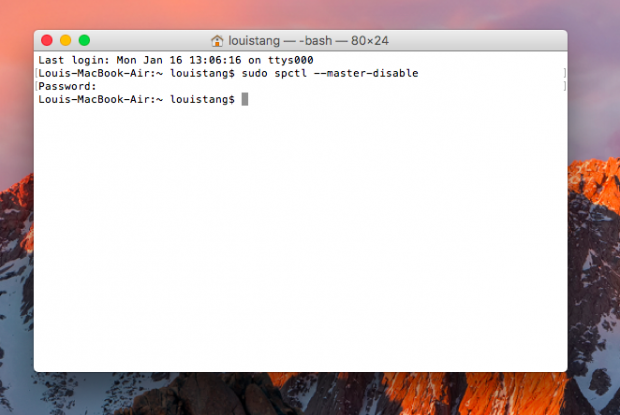 Lưu ý: Các bạn không nên để lựa chọn Anywhere được bật luôn, mà hãy tắt nó đi để an toàn hơn. Mỗi lần cần cài app tải về từ internet thì bật lại. Bình thường nân tắt, cách làm trên macOS Sierra sử dụng dòng lệnh như sau: