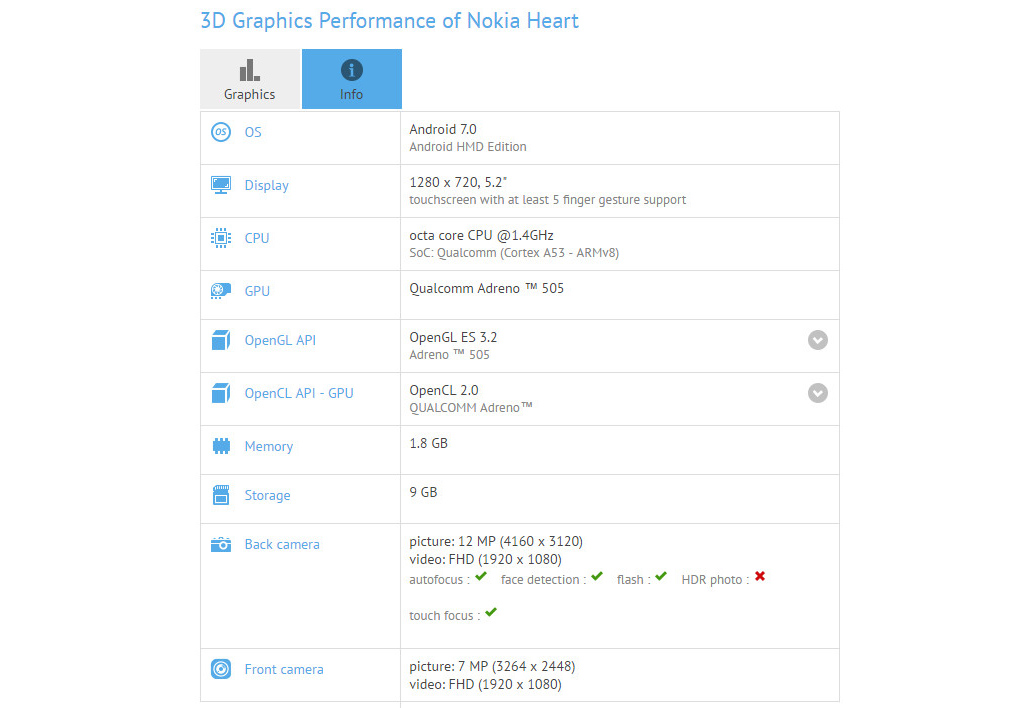 Bên cạnh đó, sản phẩm này được trang bị bộ vi xử lý Snapdragon 430 8 nhân của Qualcomm, màn hình 5.2 inch độ phân giải HD 720p (trái ngược với màn hình 5.5 inch Full-HD của Nokia 6), dung lượng RAM 2 GB đi kèm bộ nhớ lưu trữ 16 GB. GFXBench cũng cho biết rằng, chiếc Nokia Heart sẽ sở hữu bộ đôi camera chất lượng cao với mặt sau là 12 MP và 7 MP ở mặt trước.