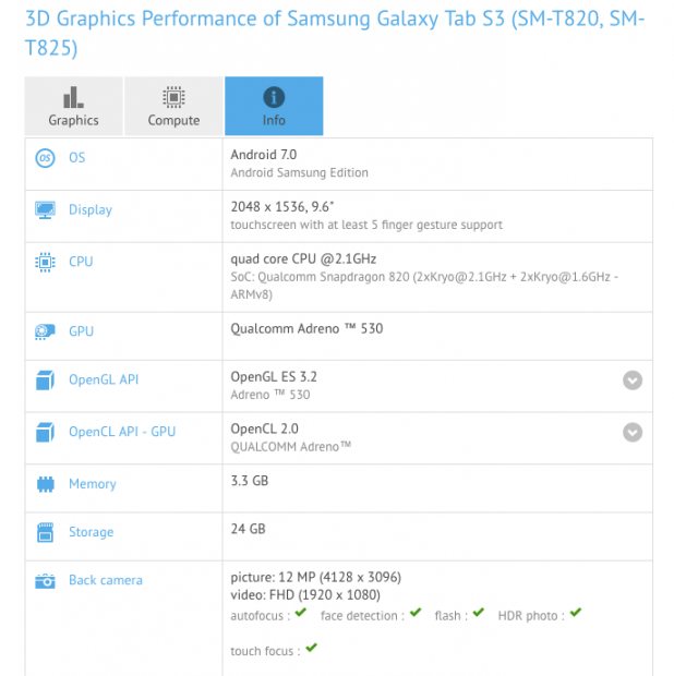 Ngoài thông tin CPU thì phần còn lại không quá khác biệt, mời các bạn xem các thông số kỹ thuật gần như hoàn chỉnh của Galaxy Tab S3: