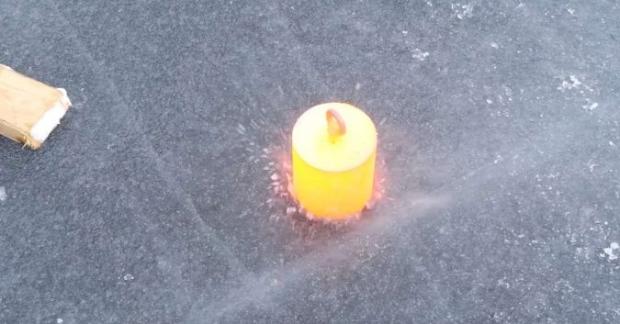 Một khối sắt nặng 20 kg được nung nóng cho đến khi rực đỏ rồi đặt lên một mặt hồ đóng băng dày 0,3 m. Ngay lập tức, âm thanh xì xì phát ra và hơi nước bốc lên từ nơi đặt khối sắt. Trong vòng một phút, khối sắt chầm chậm chìm sâu xuống mặt băng đang tan chảy, khiến mặt nước nổi bong bóng khi sôi thậm chí còn mãnh liệt hơn.