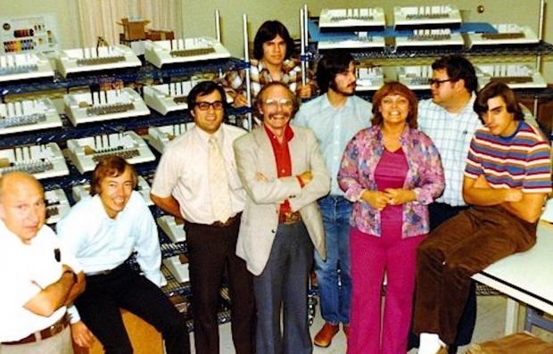 Nhóm phát triển mẫu máy tính Apple II, từ trái qua phải lần lượt là Elmer Baum, Mike Markkula, Gary Martin, Andre Sousan, Steve Jobs, Sue Cabannis, Mike Scott, và Don Breuner.